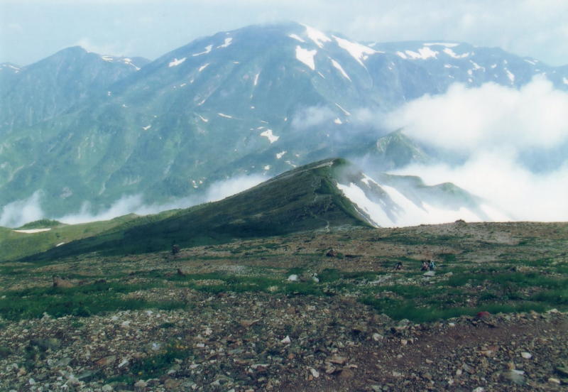 何度も雪渓を渡る。雪渓には多くの雪が残っていたが、アイゼンは誰も使用せず。