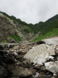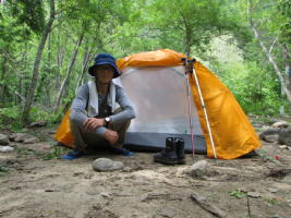 見通しの効かない薮中の登山道、黒色の小屋も現れた。八ノ沢を通り過ぎたかも・・・と不安になるが更に進む。いよいよ雰囲気が怪しくなり、対岸に渡り右岸を下りながら八ノ沢を探すことにする。 やっと八ノ沢を見つけ、やや上流でテント設営。下山者はあるが明日の登山者は自分一人、やや不安。下山する登山者に明日のルートのアドバイスを受け、水を分けてもらう。ガイド2人のグループで女性1人が腕を負傷(滑落による骨折か?)し、下山が大幅に遅れていた。 |