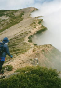 尾根の東側はガスで覆われている。