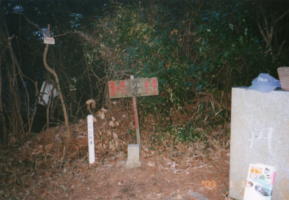 右端の立派な石碑(丹野城址)にガイドブックを立て掛け、帽子を載せて証拠写真を撮る。