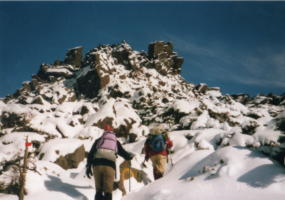 初心者向けの雪山で、北横岳〜三ツ岳〜雨池山を周るコースが面白い。ヒュッテからこの付近まで、積雪のない時期は大きな石がゴロゴロしていて歩きづらい。 |