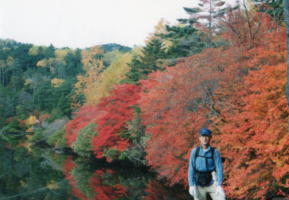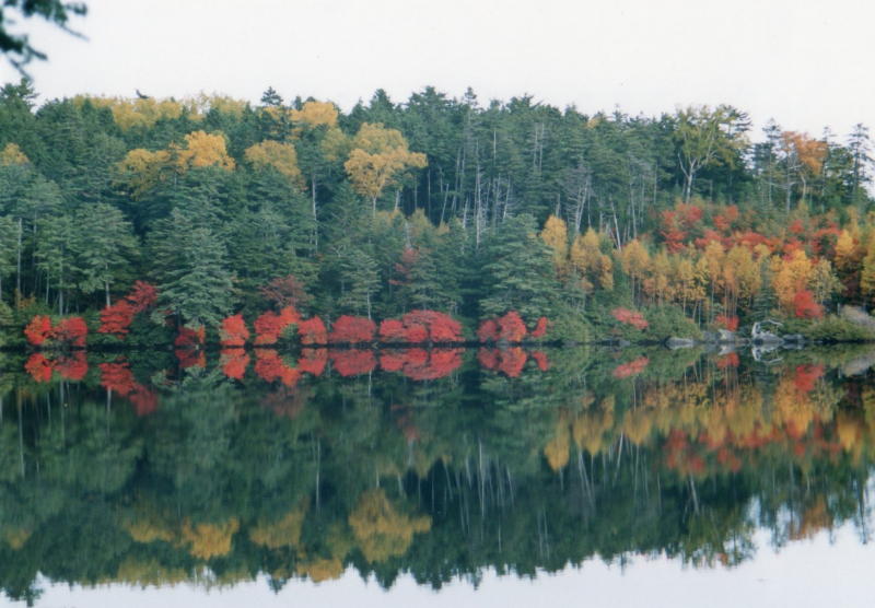 紅:ドウダンツツジ、ナナカマド 黄:ダケカンバ 緑:ハイマツ、シラビソなど 青:空 4色が湖面に映って、何とも言えない美しさ。 |