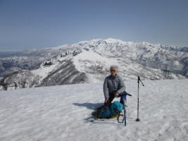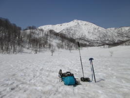 白山中居神社(駐車)〜石徹白川大進橋〜林道を和田牧場跡まで登る〜ダイレクト尾根の麓を目指す〜ダイレクト尾根を山頂へ。 林道をショートカットして牧場まで登るルートがあることは知らなかった。ガイド付きのグループが利用していたので、復路では利用した。 快晴、背後は白山。 |
