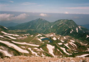 立山より大日三山を望む。山の上には日本海の水平線が見える。