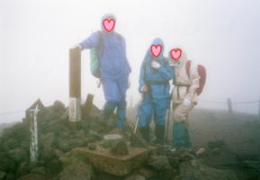 濃霧の山頂に立つ長男と連れの二人。手前に三角点と標柱の下部に女目岳の記載あり。