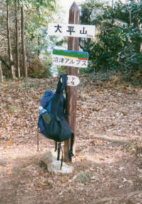 沼津アルプス縦走。大平山は最南端の山。自分のザックを掛けて撮影。