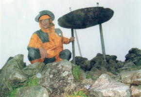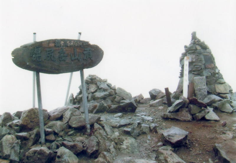 登山口から雨。尾根に出ると暴風雨で、身体が吹き飛ばされそう。小屋泊りの登山者(団体)は登頂を断念して下山してきた。