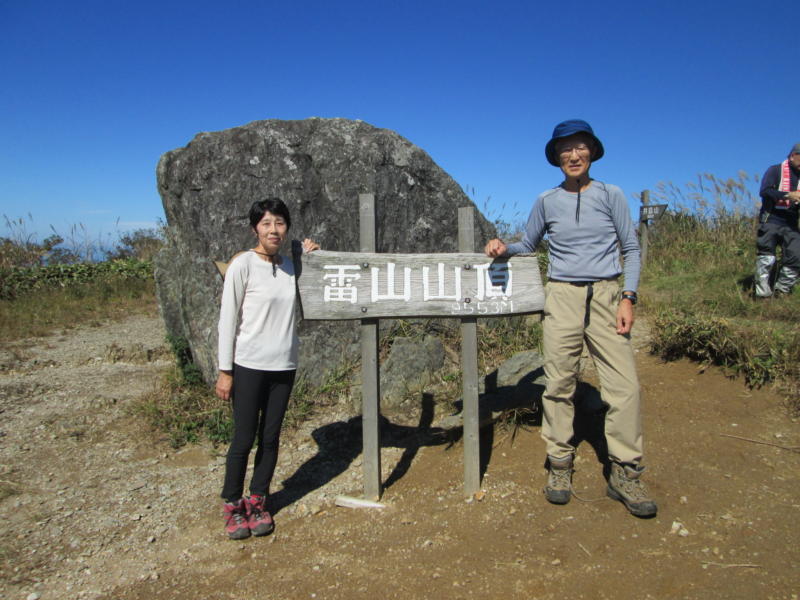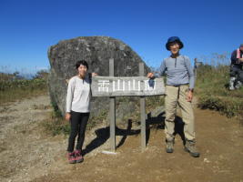 登頂すると先ほど井原山で声をかけた人たち、休憩中にも縦走してきた人たちに再会しました。この後、写真背後の石の上にて万歳ポーズで写真撮影しました。