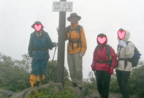 山頂までほんの5分位の場所まで行って、強風とガスのため引き返す。
