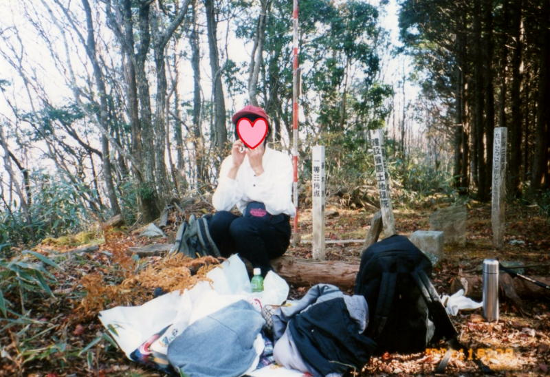 静かな山頂で妻と昼食、山頂には見事に紅葉した一本のもみじ有り。