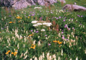 大雪渓や豊富な高山植物などで良く知られ、北アルプスでは槍ヶ岳と共に登山者に人気の山です。 お花畑を歩く。 |